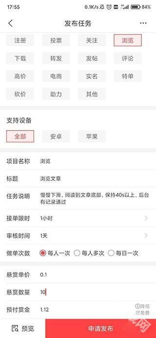 4、选择完类型和支持设备后,项目名称可以填浏览 平台,项目名称将作为标题的标签,所以标题填浏览文章接下来是任务说明,可以在这里写上注意事项和要求,比如要求阅读长,用什么来阅读
