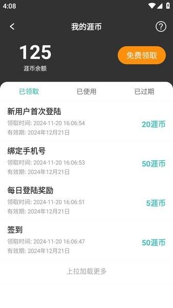 进入涯币详情后,包括了“已领取”、“已使用”和“已过期”;