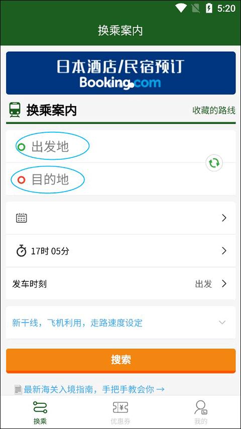 首先我们进入换乘案内app,在主页我们可以选择自己的出发地、目的地和出发时间,选择好后点击搜索。
