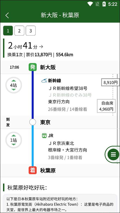 这里小编以从新大阪去往秋叶原为例,可以看见app给我们推送了3个方案,也将3个方案所需要花费的时间和购买的票价标识出来了。