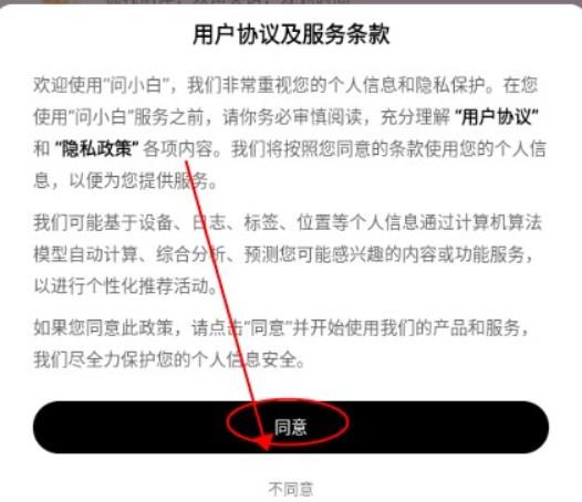 《问小白》软件用法:1、点击同意用户协议及服务条款;