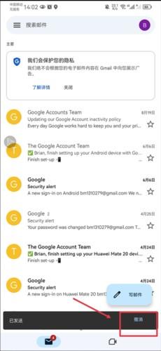 《谷歌邮箱》怎么撤回邮件1、用户在写完邮件并发送后会跳转至首页,同时首页下方会显示已发送通知,这时点击撤消功能