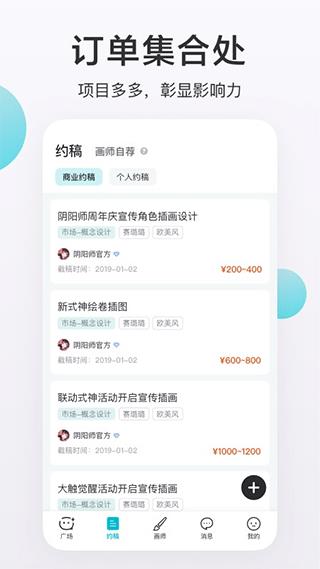 画加app是一款特别靠谱又高效的动漫约稿软件,用户在这上面可以轻轻松松地进行美术稿件的交易。画师们可以通过发布作品增加曝光度,吸引更多的约稿需求者,还可以把它当成一个绘画交流的平台,快速找到志同道合的小伙伴,分享动漫和绘画心得。整个约稿过程既安全又真实,为交易双方提供了充分的沟通空间,非常适合二次元爱好者下载体验。