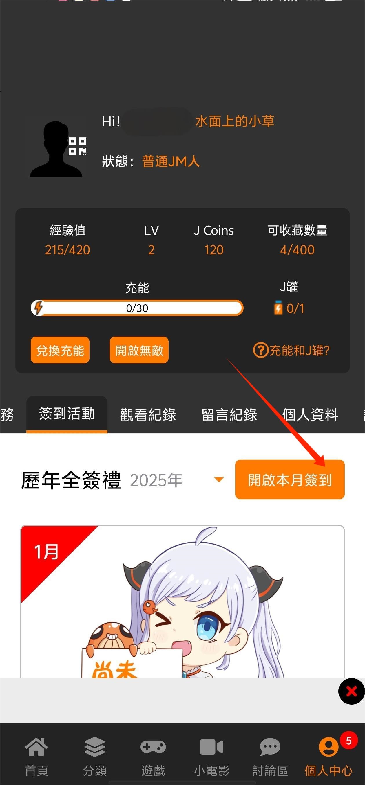 《jm漫画》怎么签到(2025.7.18更新):1、打开个人中心