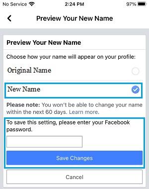 4、在下一个屏幕上,检查您的新名称,输入您的Facebook 密码,然后点击保存更改按钮
