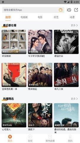 1. 主页上有最新流行的电影和电视推荐,顶部有搜索框、播放唱片和下载唱片