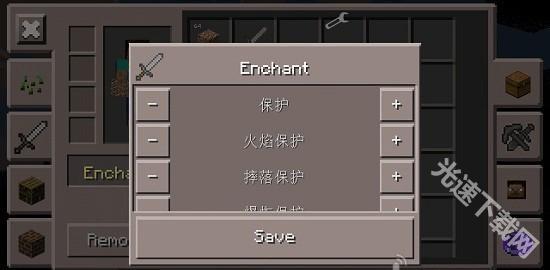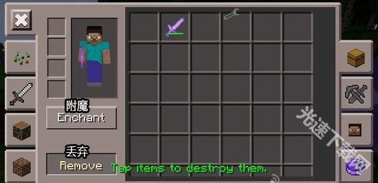 2、进入物品界面,我们能看到背包里的各种物品,还能通过附魔按钮直接附魔物品,可以为各种物品附魔,不光是武器和工具,草方块也能附魔。