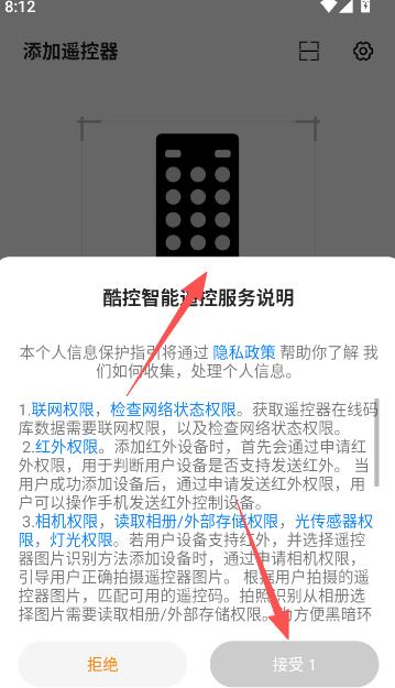 【遥控专家酷控app怎么使用】1、阅读酷控智能遥控服务说明内容部分,点击接受进入软件使用界面。