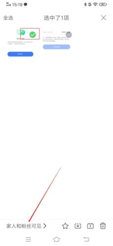 3、然后我们就可以勾选想设置自己可见的照片,选择完毕后点击左下方的“家人和粉丝可见”进入权限设置;