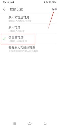 4、在权限设置页面,点击下方第三个选项“仅自己可见”,最后点击右上方的“保存”,这样可以将这照片设置为自己可见了。
