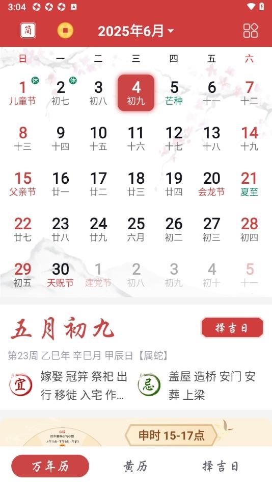吉辰万年历app如何使用:1、映入眼帘的是一个清晰明了的日历页面,公历与农历日期同步展示,一目了然。日期下方详细标注了星期、节气、节日等关键信息,让用户对时间的流转有更直观的认识;