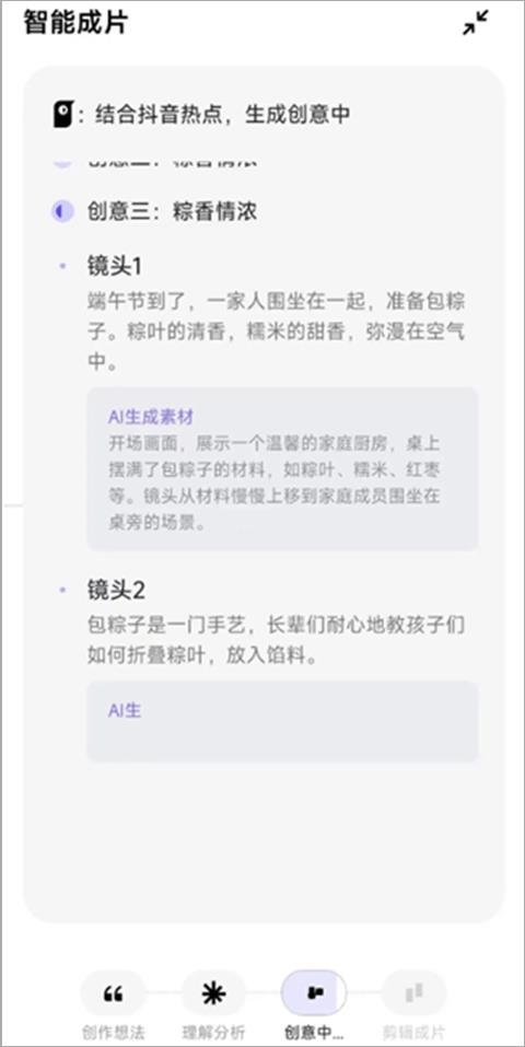 选择“智能成片”,在对话框输入想做的内容,比如“端午节一家人包粽子”