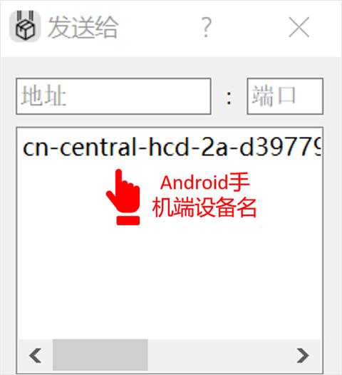 2、在两个设备软件都同时打开的状态下电脑端会出现如下界面。选择“传送设备的名称”,点击发送;