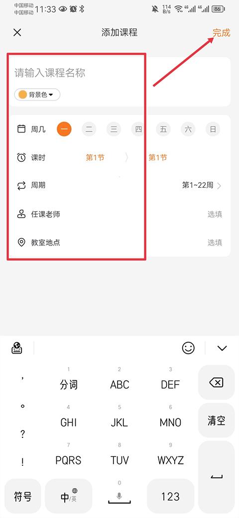 4、最后将课程名称、周几、课时、任课老师、教师地点等信息完善后点击完成即可