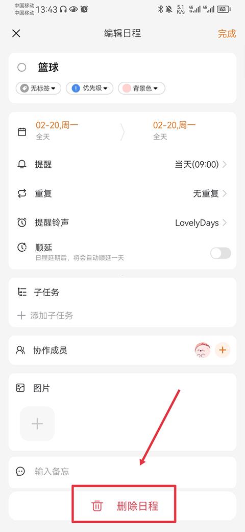 2、点击后即可进入编辑日程界面,然后点击下方的删除日程即可删除