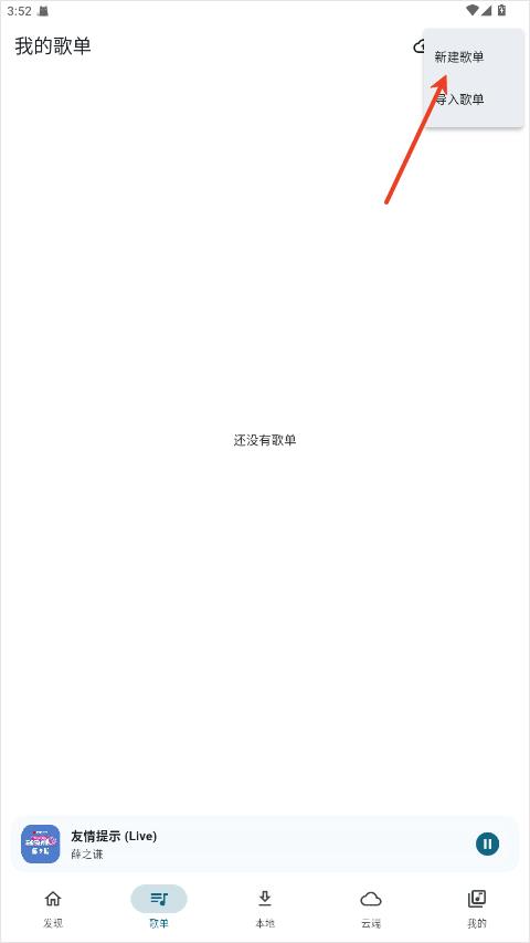 4、进入 “歌单” 页,点击 “新建歌单”,输入名称,将喜欢的歌曲添加到自建歌单,分类管理音乐。