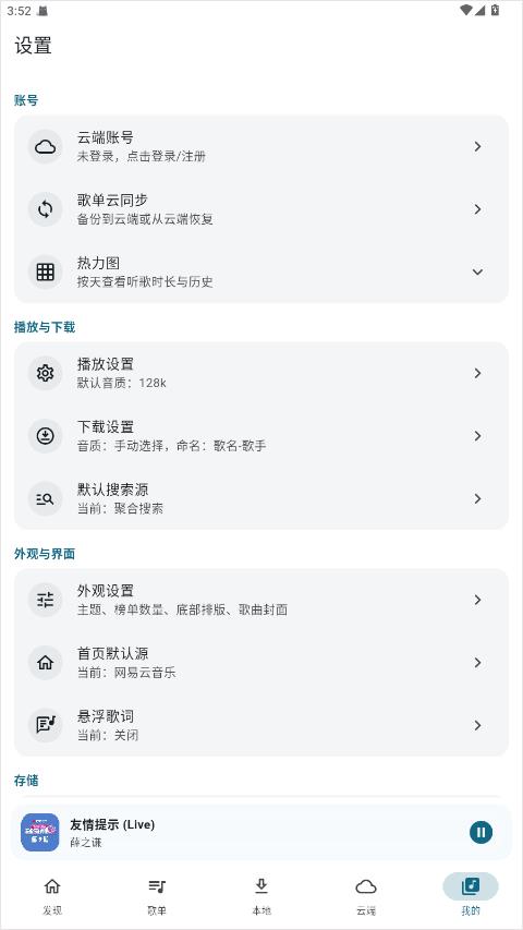 7、在 “我的” 设置中心,调整播放音质、缓存路径、歌词显示样式,自定义 App 使用体验。