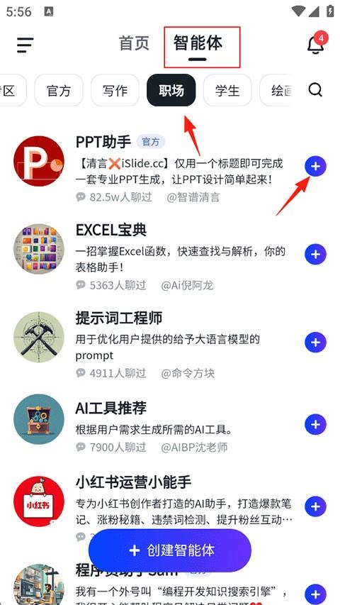 智谱清言怎么生成PPT?1、在智谱清言首页点击智能体-职场-添加PPT助手;
