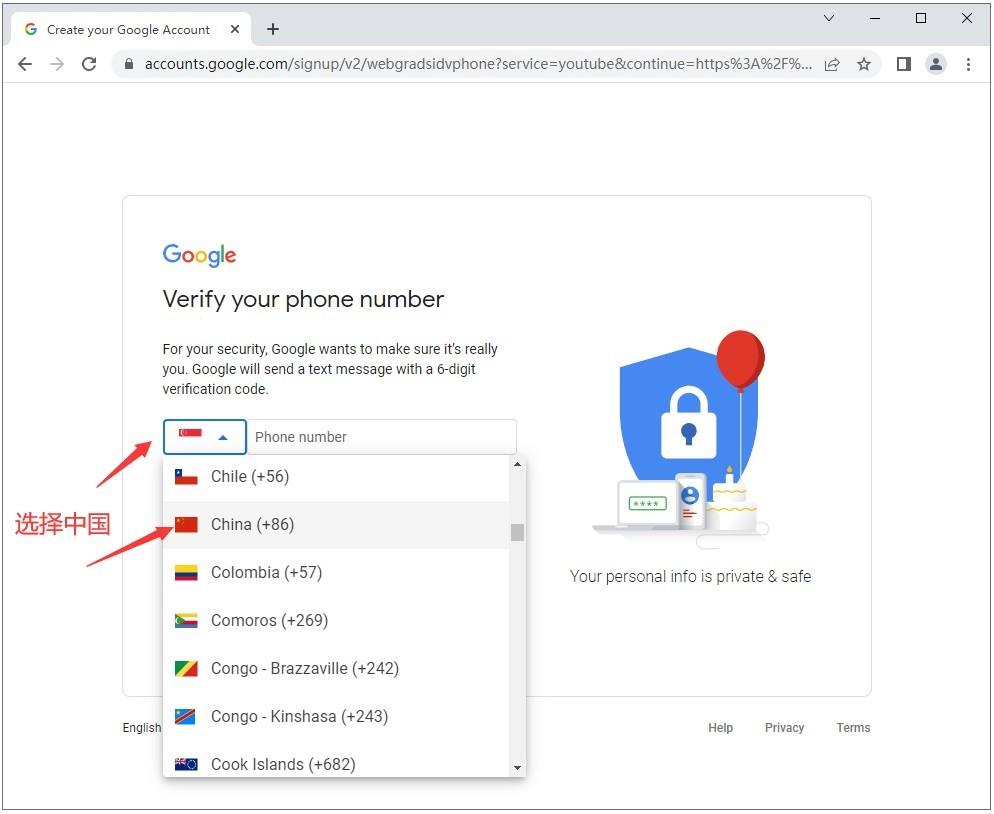 6、在该页面,我们需要选择您所处国家的手机区号,如果在中国境内,您需要选择“ 86”的区号。
