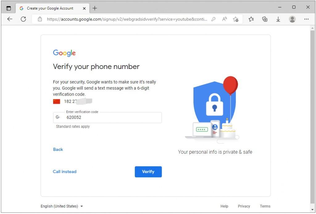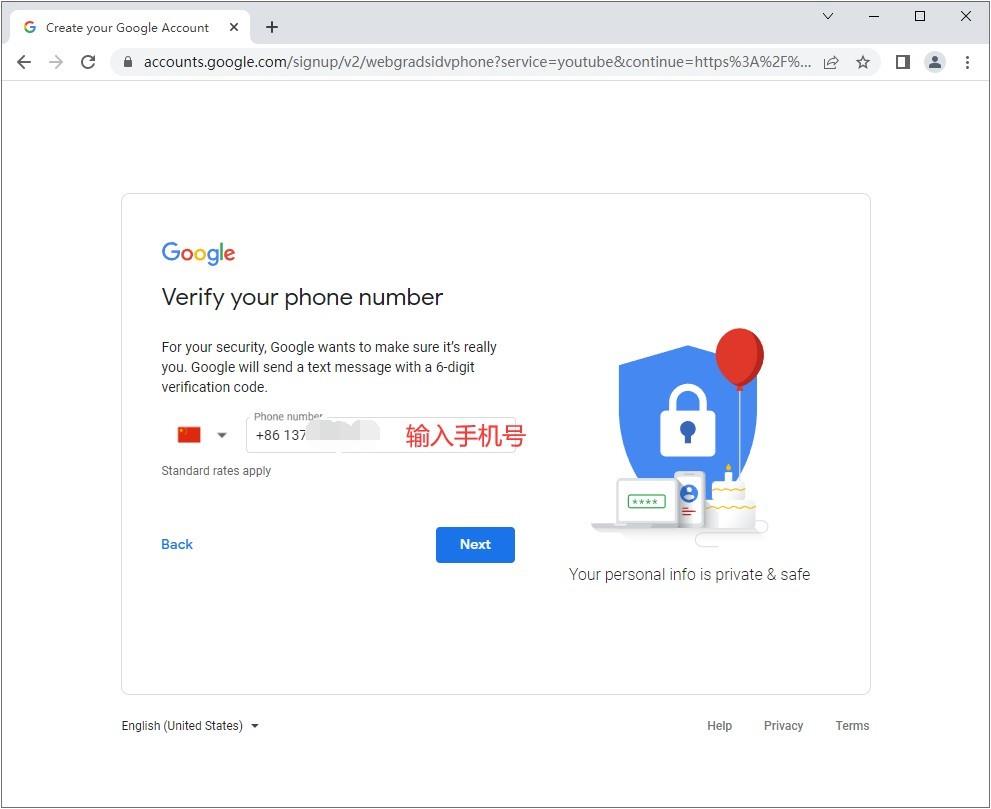 8、输入收到的手机验证码,很多人在这一步就无法进行下去,主要是浏览器没有使用英文,而导致接受不到验证码,被谷歌提示“此电话号码不能用于验证。”。
