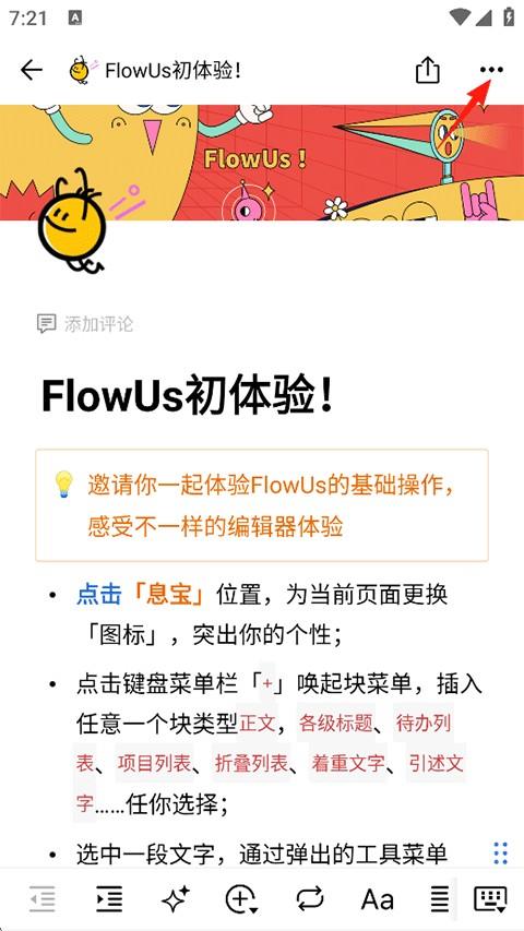 《flowus息流》怎么导出页面?1、打开FlowUs息流,选择一个需要导出的页面文档并点击右上角的...扩展按钮;