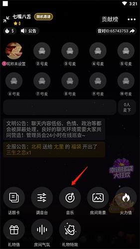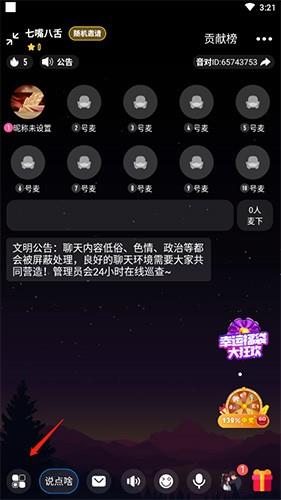 音对语聊App如何添加音乐?1、进入你所在的语聊房间,在页面底部找到并点击【更多功能】入口。