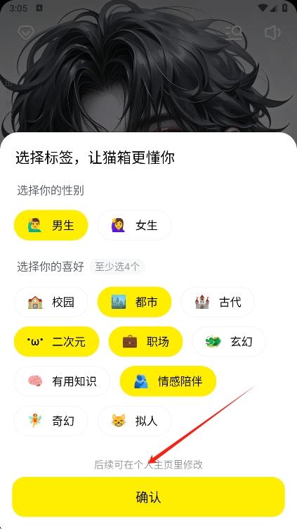猫箱app使用教程:1、在本站下载安装并打开,选择你的标签,至少4个标签,点击确认;