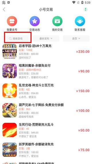 2、然后在小号交易的页面中搜索想要购买的小号游戏;