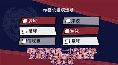 2、选择喜欢的运动,每种选项对应一个攻略对象,足球汉化有误,应该是橄榄球。