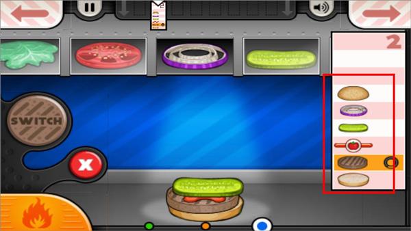 3、来到制作台制作汉堡,根据页面右边菜单要求制作,依次放入食材;