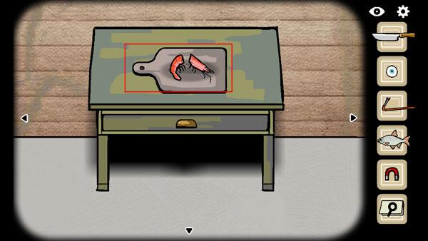 6、把虾放砧板上切开,得到钥匙,和虾头。虾头会钓上来个死人,刀划开得到苹果,完成“苹果”成就