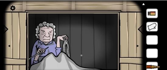 3、解决蜘蛛网与柜子:用火柴烧掉天花板蜘蛛网,获得小钥匙,打开绿色门旁的柜子,发现一位老奶奶。