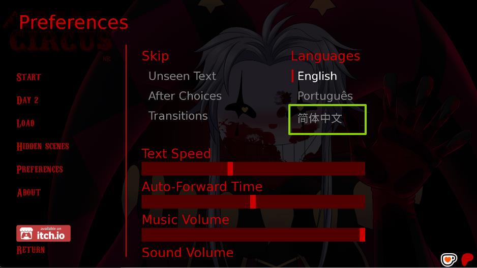 怪胎马戏团汉化直装游戏怎么切中文1、在游戏主界面点击“PREFERENCES”(设置)选项,进入设置页面。