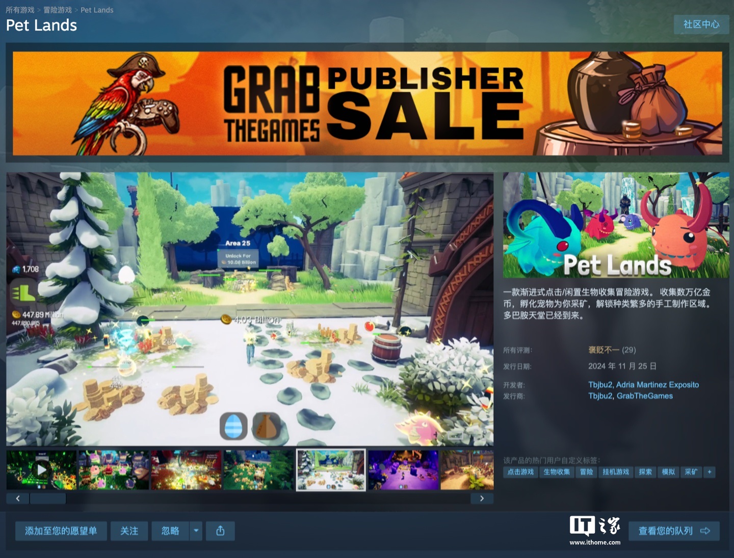 好消息!Steam上这款《Pet Lands》宠物收集放置游戏正在限时免费送。原价58元,由Tbjbu2团队开发,大家抓紧时间,在3月23日凌晨1点前都可以免费领到库里去。游戏页面链接在这里:https://store.steampowered.com/app/3144950/Pet_Lands/。