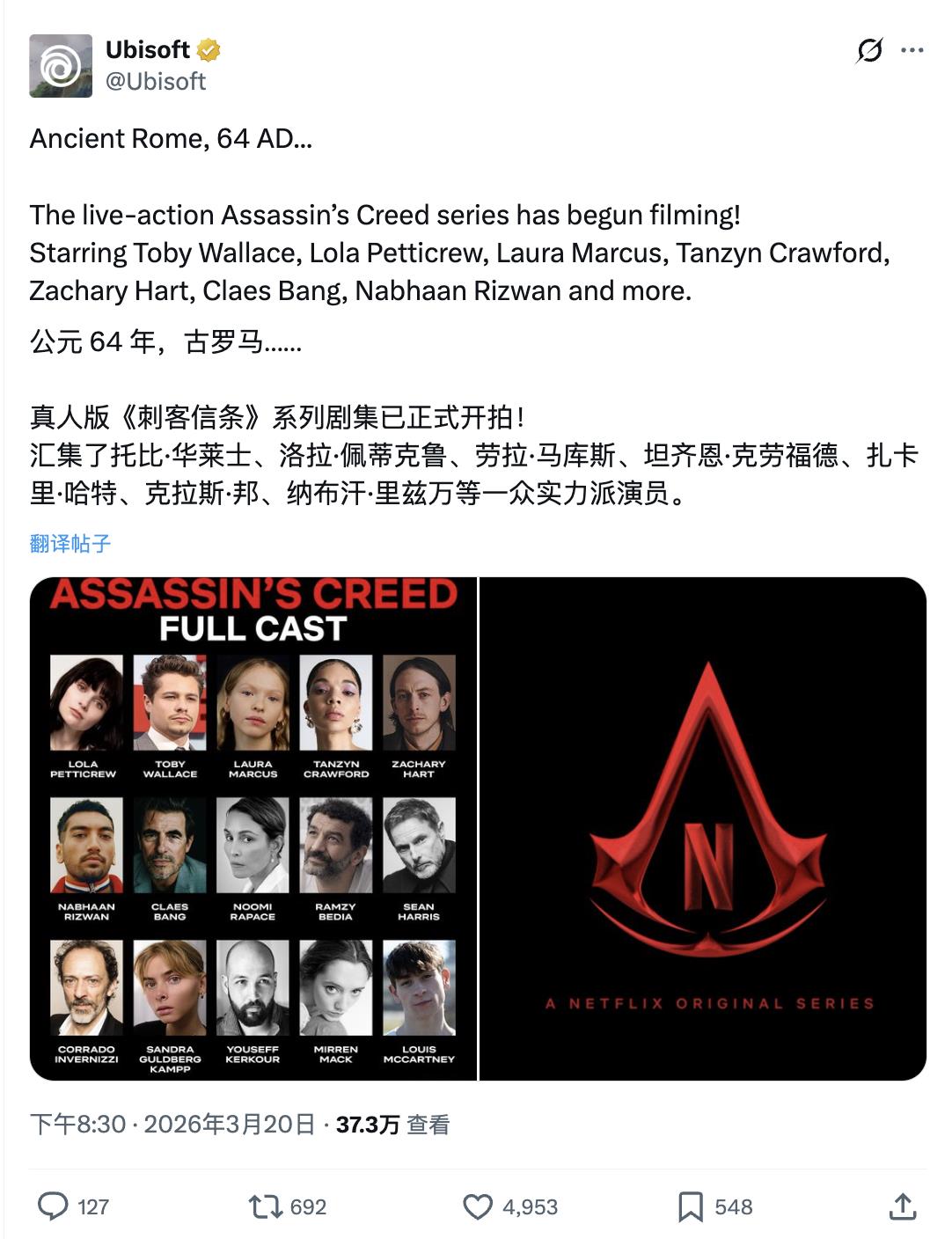 育碧在X平台公布了《刺客信条》真人剧开拍的消息,背景定在公元64年的古罗马,托比·华莱士和萝拉·佩蒂克鲁两位演员担任主演。
