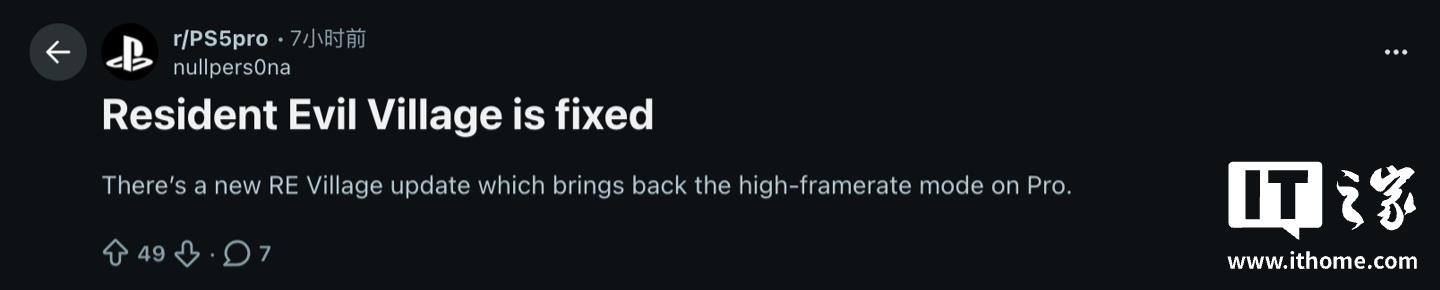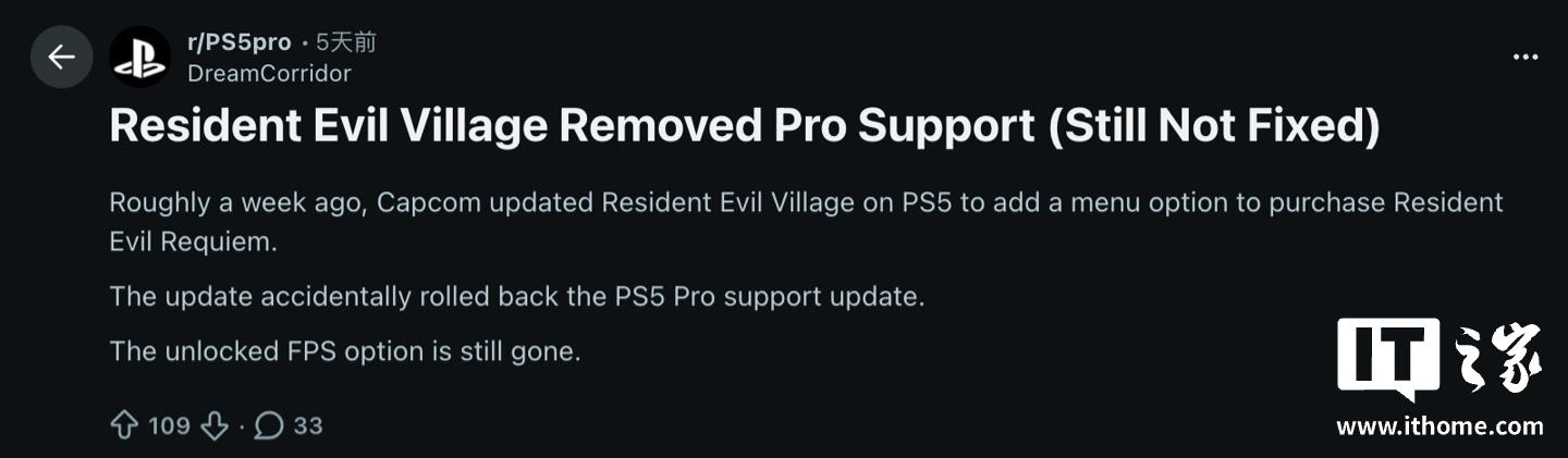 不过后续 Reddit 有用户陆续发现,在更新该版本后,游戏在 PS5 Pro 平台上的“解锁帧率”(120Hz)功能丢失,导致玩家仅能以相对更低的帧率运行本作。