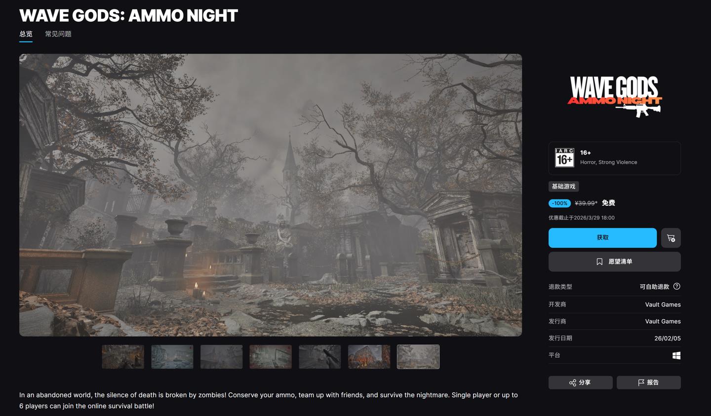 3月23日消息,《波神:弹药之夜》原价39元的游戏,现在在Epic游戏商城开启了限时免费领取活动。不过,这次免费是由发行商发起的,不是平台官方活动,玩家可以在3月29日19:00前领取,商店页面链接在这:https://store.epicgames.com/zh-CN/p/wave-gods-ammo-night-7eb978。