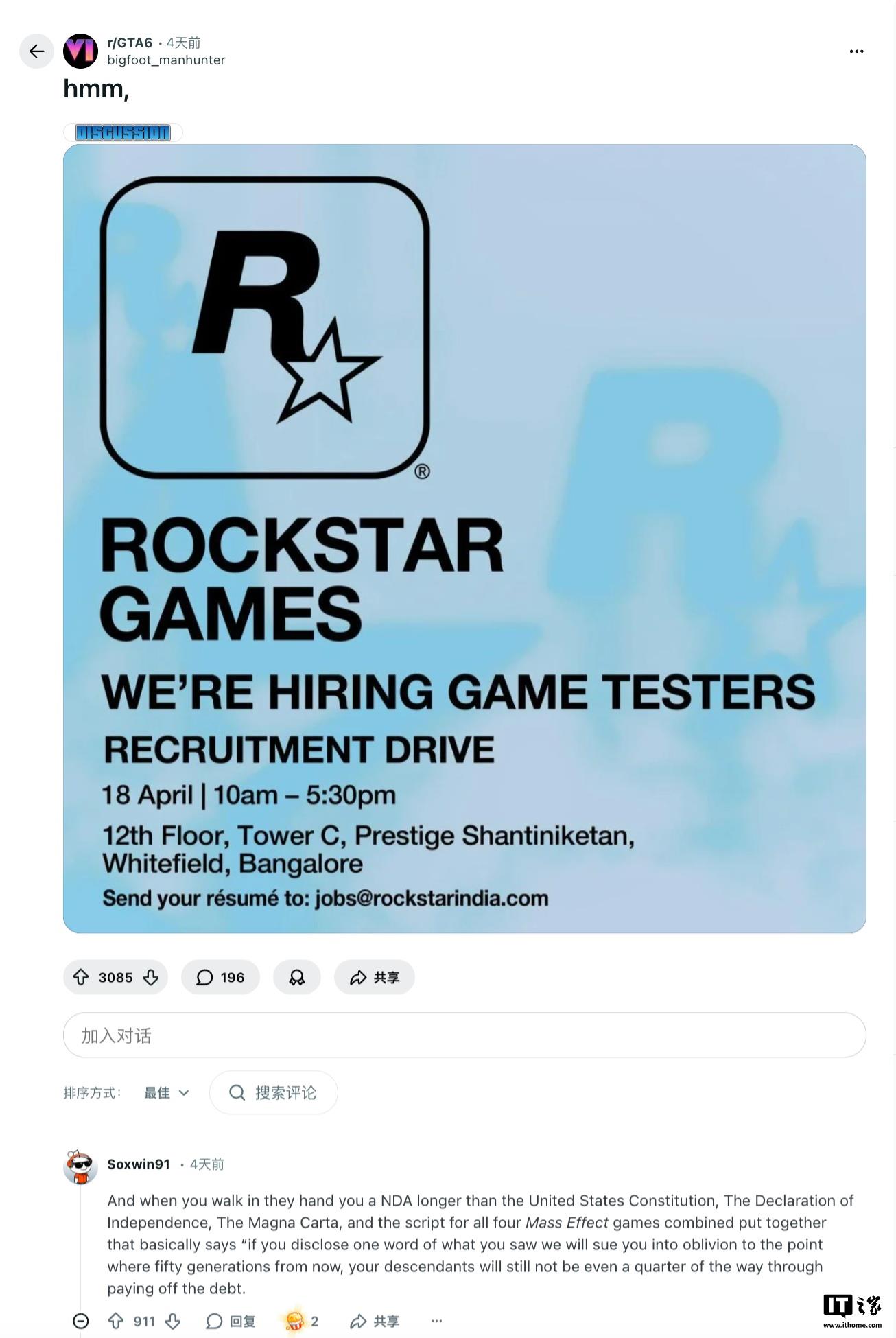 参考 Reddit 贴文,有人跃跃欲试,恨不得马上投简历;也有人站出来“劝退”:“作为一个测试员,我可以告诉你,上报 Bug 是件极其痛苦的事。你得精确记录触发条件、复现步骤,把数据整理得明明白白。如果你是想享受游戏,千万别来。”还有人开玩笑说:“想象一下,为了测试《GTA6》专门去办个工作签证。”