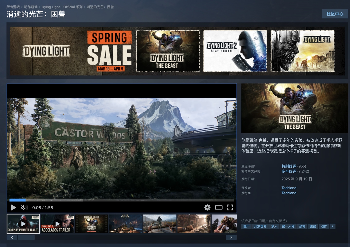 回顾《消逝的光芒:困兽》,本作于 2025 年 9 月 19 日 0 点发售,在 Steam 国区定价为 248 元起,现在 7.5 折后到手价低至 186 元起(促销将于 3 月 27 日结束),附游戏商品页(https://store.steampowered.com/app/3008130/_/)。