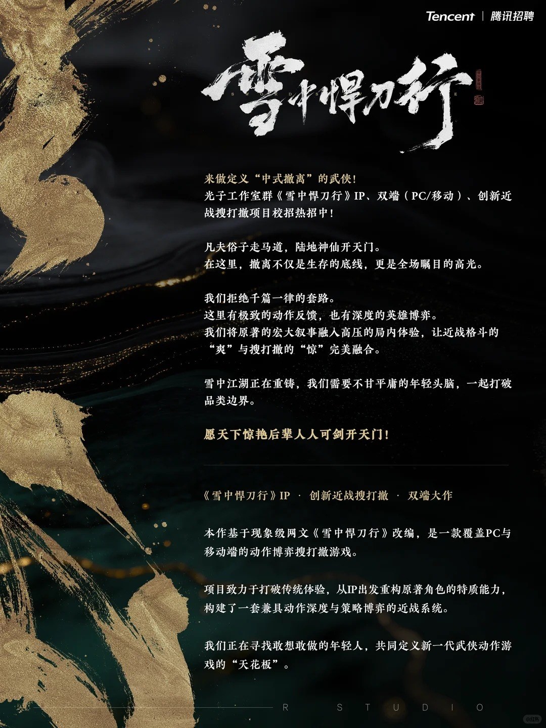 2月14日消息,腾讯光子工作室群的光子R工作室昨天发布了2026校园招聘信息,同时透露了两款3A游戏新作,一个是武侠题材的《雪中悍刀行》,另一个是仙侠单机《剑来》。