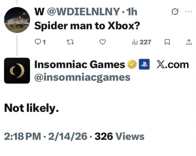 2月15日的消息,索尼的失眠组(Insomniac Games)昨天在X平台上回应粉丝提问时提到,《漫威蜘蛛侠》系列游戏基本上没啥希望登陆微软的Xbox平台。