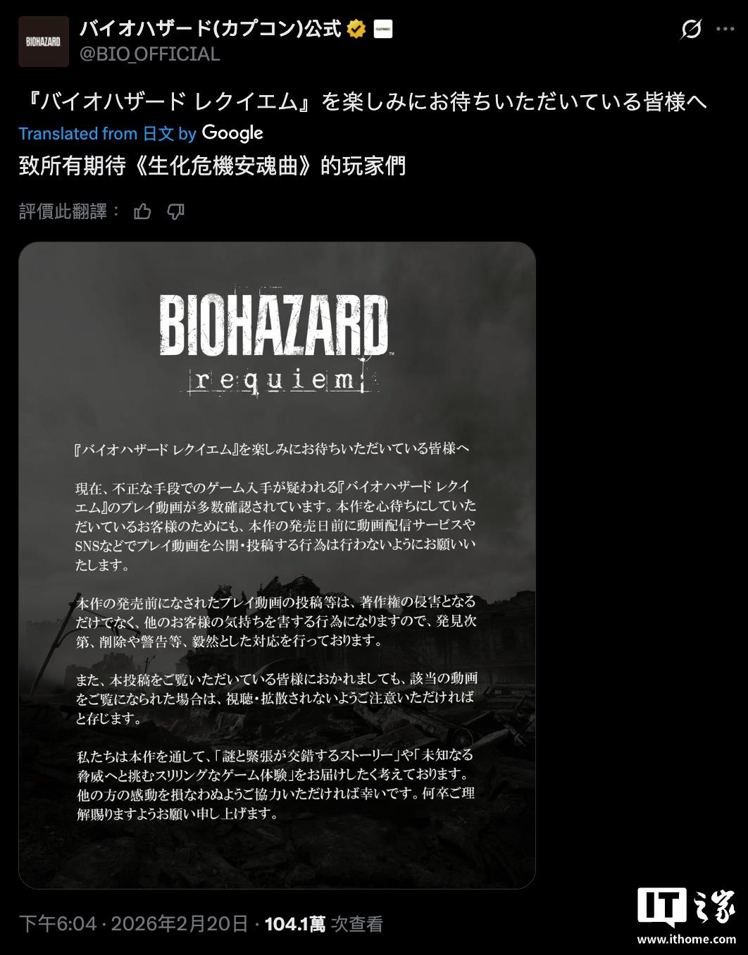 2月20日,卡普空在X平台发声,对《生化危机:安魂曲》剧情被提前泄露的行为表示强烈不满,并承诺将严肃处理此事。