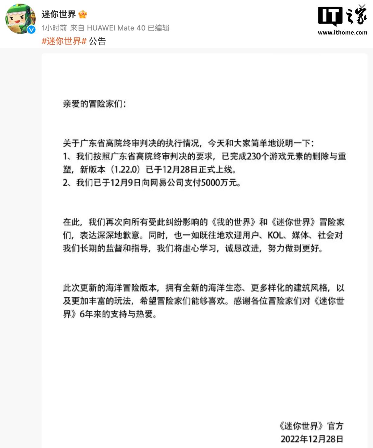 据此前报道,《我的世界》国服运营方网易曾和《迷你世界》开发商深圳迷你玩公司对簿公堂,2022 年 11 月底,广东省高级人民法院对广州网易公司、上海网之易公司诉深圳迷你玩公司著作权侵权及不正当竞争纠纷案作出终审判决,认定深圳迷你玩公司构成不正当竞争,判令其删除游戏中 230 个侵权元素,并赔偿网易公司 5000 万元。这也是当时国内游戏侵权纠纷案件最高判赔数额。
