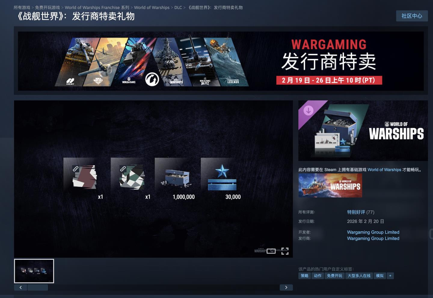 2月24日消息,Wargaming在Steam平台推出发行商特卖活动,活动从2月19日开始,为旗下“World of”系列的4款免费游戏提供限时免费DLC领取机会。活动将在2月27日凌晨3点结束,但部分DLC领取截止日期为2月26日。