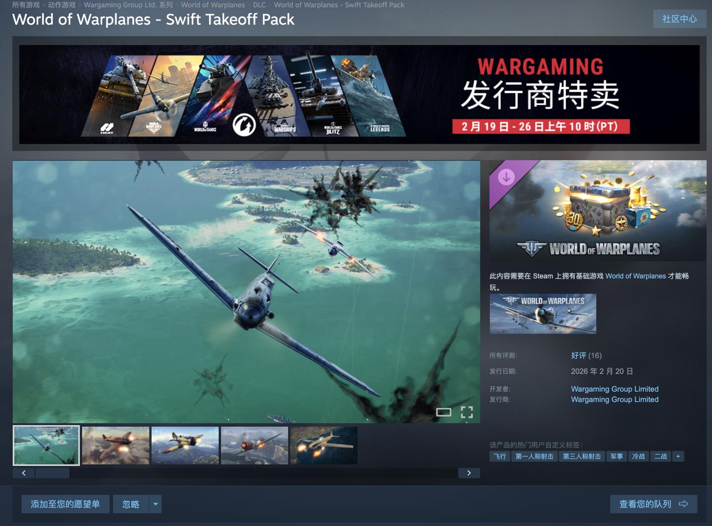 其中,账号加成可提升每场战斗收益,银币有助于购买新型战机;多种消耗品和弹药则将在空战中提供关键优势。本次 DLC 为发行商特卖专属内容,开放时间为 2 月 19 日至 26 日,附免费领取地址(https://store.steampowered.com/app/4273720/World_of_Warplanes__Swift_Takeoff_Pack/)。