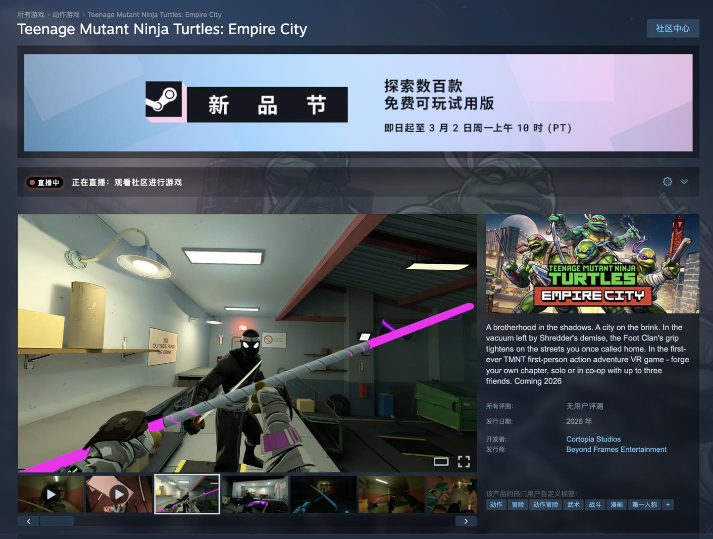 本作将于今年春季登陆 Quest 3/3S、SteamVR 以及 Pico 平台,定价 20 美元(注:现汇率约合 138.3 元人民币),附 Steam 页面(https://store.steampowered.com/app/3713650/Teenage_Mutant_Ninja_Turtles_Empire_City/)。