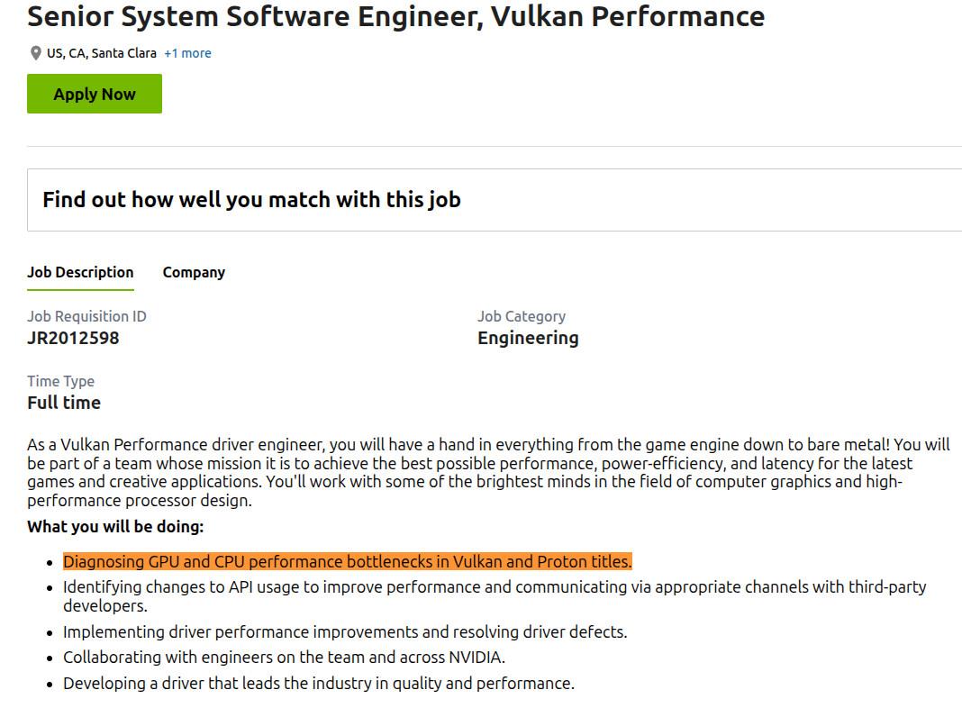 2月25日,科技媒体TechPowerUp发文透露,英伟达最近放出多个招聘信息,虽然现在已经删掉了。这次招聘主要是为了寻找工程师,目标是提升Linux系统中Proton兼容层和Vulkan API的性能表现,为他们的游戏掌机芯片发展助一臂之力。