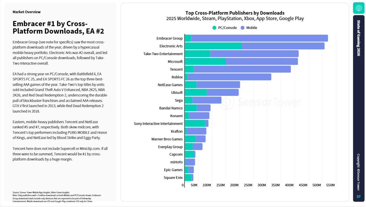 Embracer Group 排名第一,是因为该数据未包含 Supercell 或 Miniclip 的数据;若不剔除这些,腾讯在 PC、主机和移动端合计下载量中位列第五。