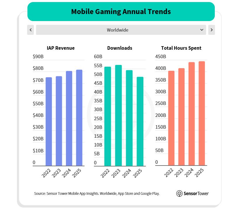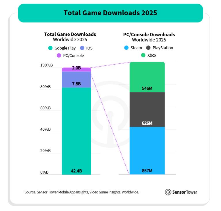 数据显示,2025 年全球游戏下载量达 520 亿次,其中绝大多数来自移动设备 ——Google Play 以 420 亿次下载展示了 Android 在全球的市场渗透率,是 App Store 的四倍以上,但后者的游戏应用内购买收入高出 75%。剩余 20 亿次下载来自 PC / 主机平台。
