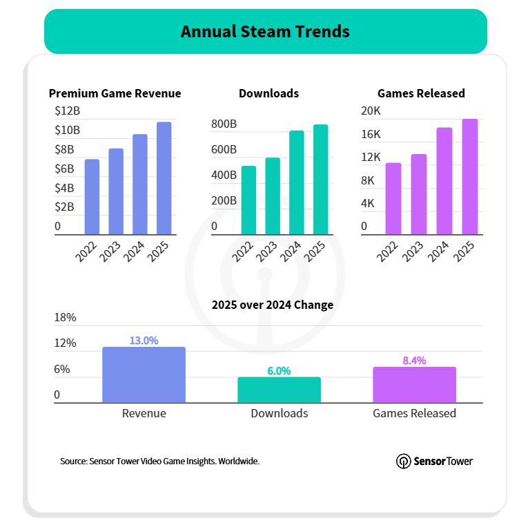 PC 平台 Steam 在多指标上创下纪录,包括付费游戏收入、下载量和发布游戏数量。表面上看收入增长集中在 AA 和 AAA 级发行商,特别是动作和射击类游戏。但由于 2024 年《黑神话:悟空》以独立发行商身份达到 AAA 级规模,使得年度对比更为复杂 —— 剔除其影响后,独立发行商收入实际仍在同比增长。